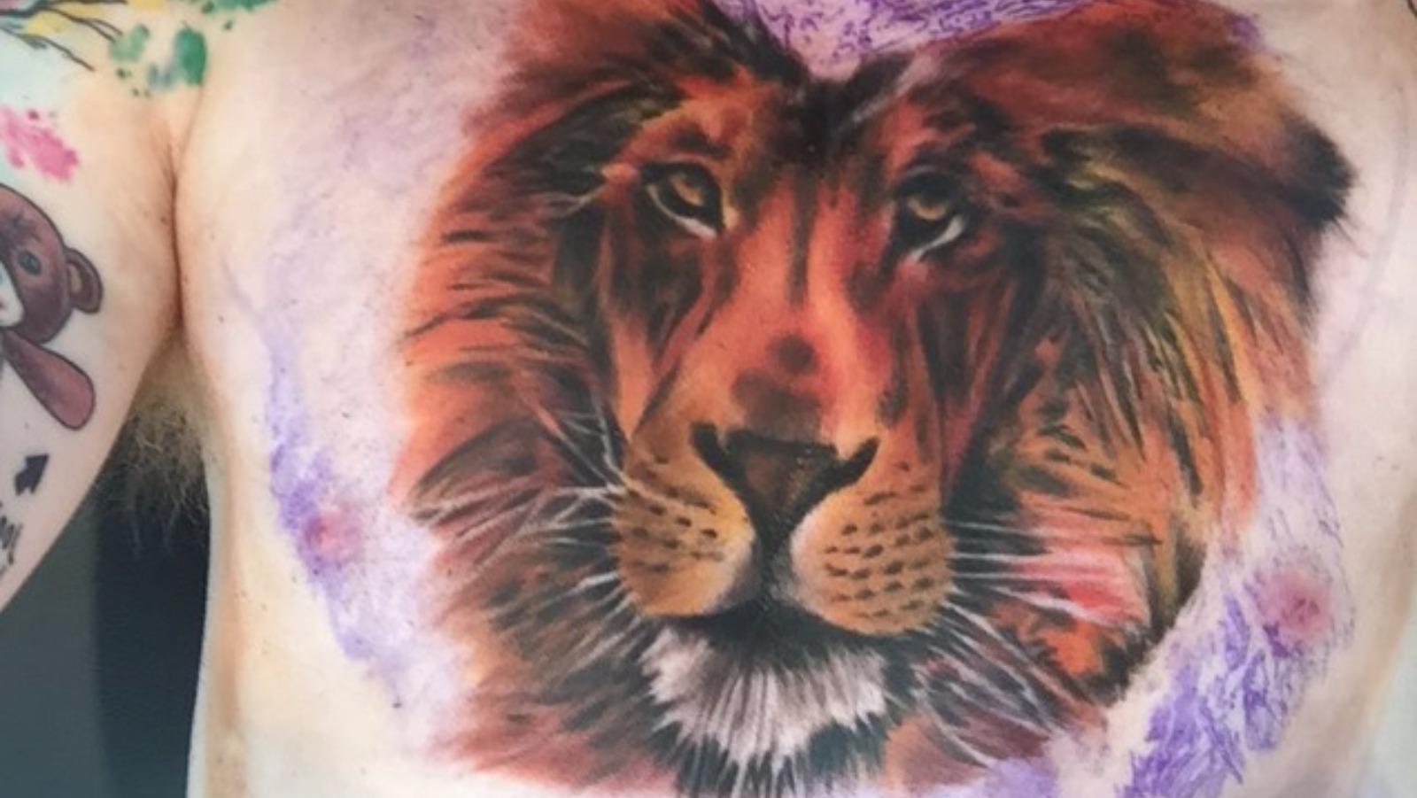 An enormous, colorful lion splayed across his chest.. . An enormous, colorful lion splayed across his chest.